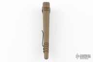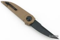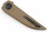 This Phoenix model sports a coyote handle with a phoenix laser etching and a CPM-S30V steel blade with a black cerakote finish. The top edge of the knife has been sharpened.
