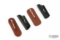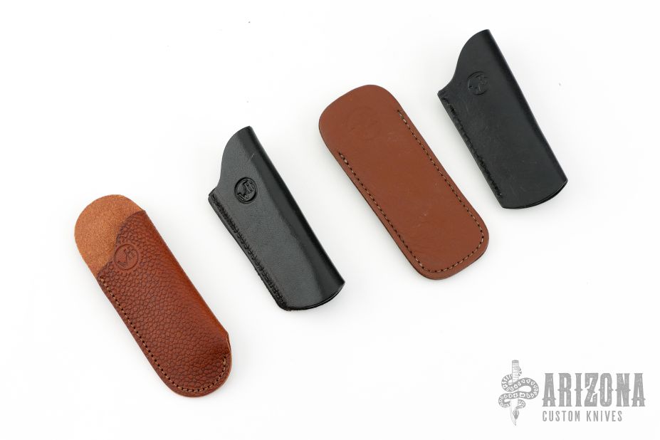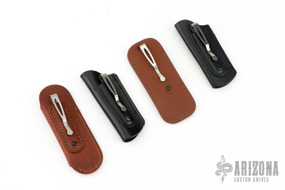 Four leather sheaths with clips, two larger, brown, two smaller, black. Excellent condition.