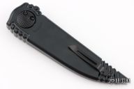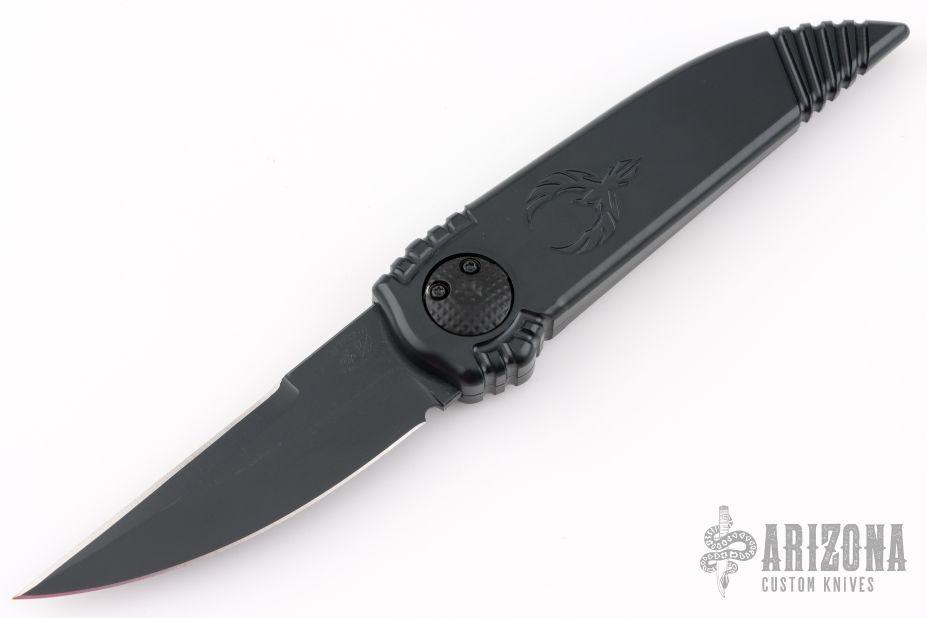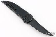 This Phoenix model sports a black handle with a phoenix laser etching and a CPM-S30V steel blade with a black cerakote finish. The top edge of the knife has been sharpened.