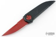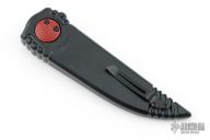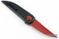 This Phoenix model sports a black handle with a phoenix laser etching and a CPM-S30V steel blade with a red cerakote finish. The top edge of the knife has been sharpened.