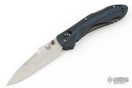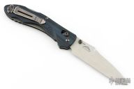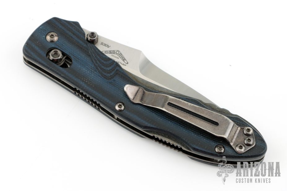 This 930BK Kulgera from Benchmade features a stonewashed recurve blade with swedge and dual thumbstuds. The handle is comprised of blue and black G10 scales over black steel liners and stand-offs. Stainless steel tip up clip is reversible for left or right hand carry. Has scuffs and scratches, has been resharpened, good condition otherwise.