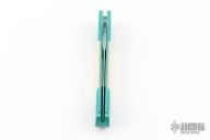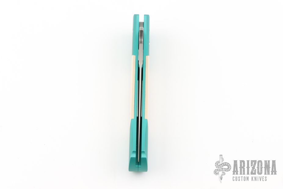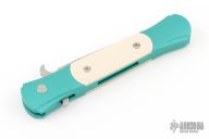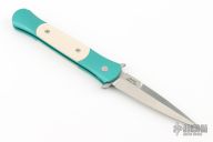 This Don features a satin finish blade, teal aluminum handle, and polished ivory paper micarta inlays. Excellent condition with original box and papers. "PR8 #530" on blade.