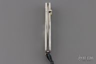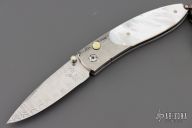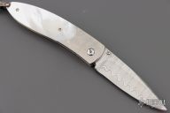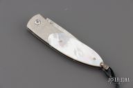 This Monarch button lock folder features a ZDP-189 "wave" San Mai Damascus blade. The handle has stippled titanium bolsters with integral liners, mother of pearl scales. Gold lip pearl insets in thumb stud and button lock. Sterling silver bail and beads. Includes original box, leather sheath and certificate of authenticity. Excellent condition.
