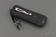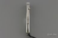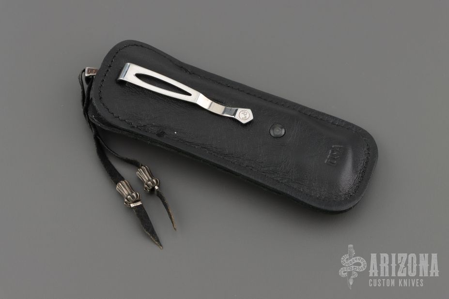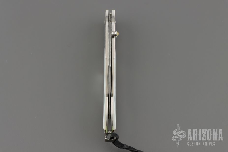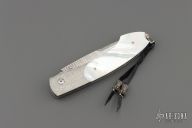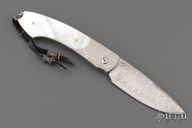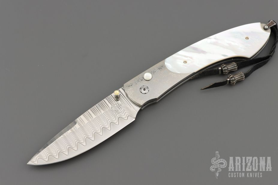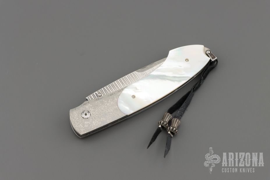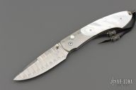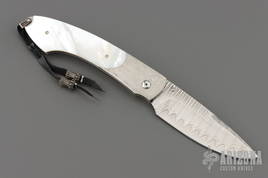 This button lock folder features a ZDP-189 "wave" San Mai Damascus blade. The handle has stippled titanium bolsters with integral liners, mother of pearl scales. Gold lip pearl insets in thumb stud and button lock. Sterling silver bail and beads. Includes original box, leather sheath and certificate of authenticity. Excellent condition.
