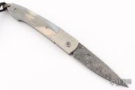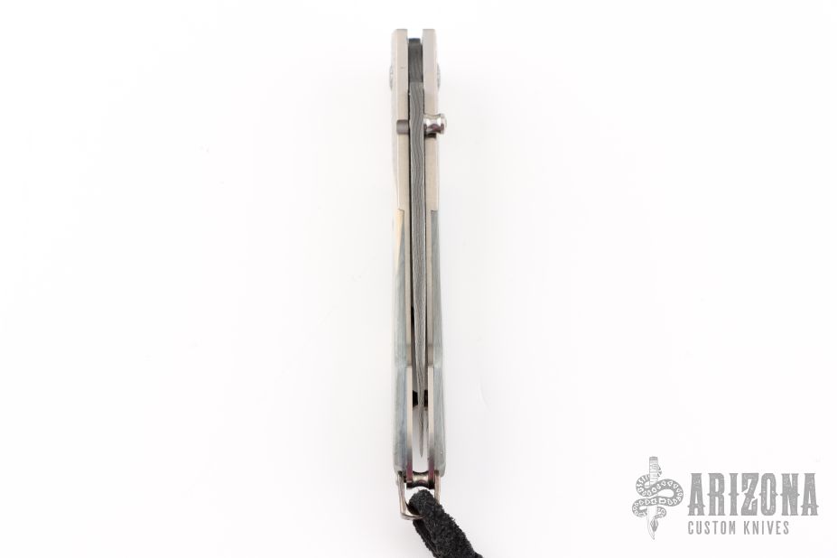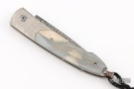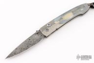 The A.G. Russel Exclusive B10 AG1 from William Henry features a drop point Mike Norris Stainless Raindrop Damascus blade with single sapphire inlaid thumbstud. The handle is comprised of a stippled titanium frame with Mammoth ivory scales and titanium barrel spacers. The titanium button lock also has a sapphire inlay. Also features sterling silver bail and beads with a braided leather lanyard. Great blade seating and lock up. Comes with original box, coa and sheath. Excellent condition.