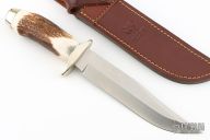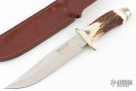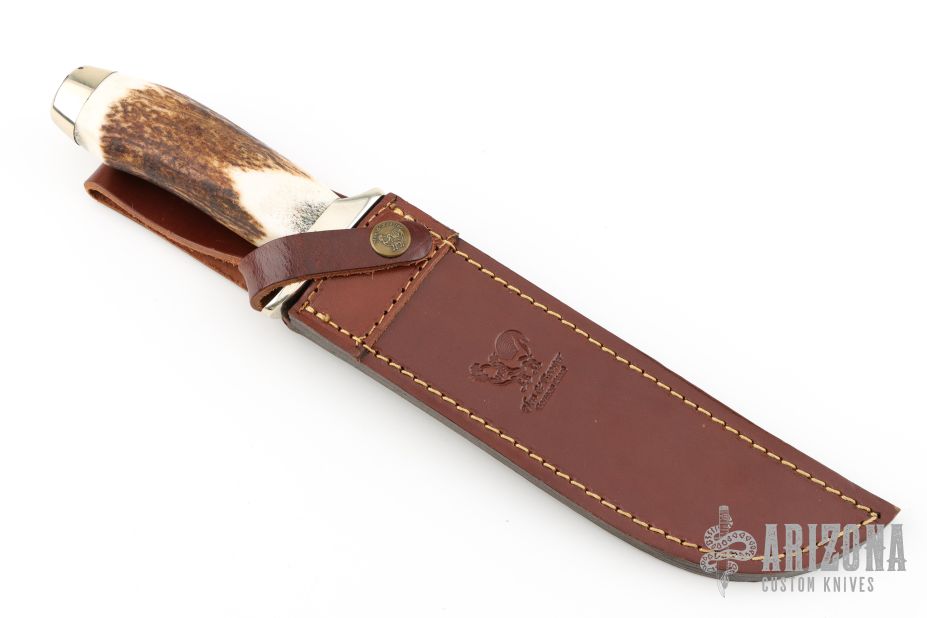 This Hunter by Hen & Rooster Knives features a satin finished blade with false top edge, .174" blade stock and 1.314" blade depth, hidden tang construction. The handle has a nickel silver guard and butt with a stag grip. Comes with original brown leather sheath. The handle is loose, otherwise good condition.
