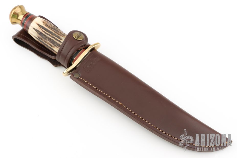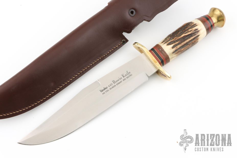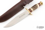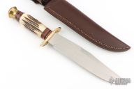 This Bowie by Linder features satin finished clip point blade with a false top edge, .181" blade stock and 1.555" blade depth, hidden tang construction. The handle has a brass guard and butt, stag grip with red/brass/black/wood spacers. Comes with original brown leather sheath. Excellent condition.