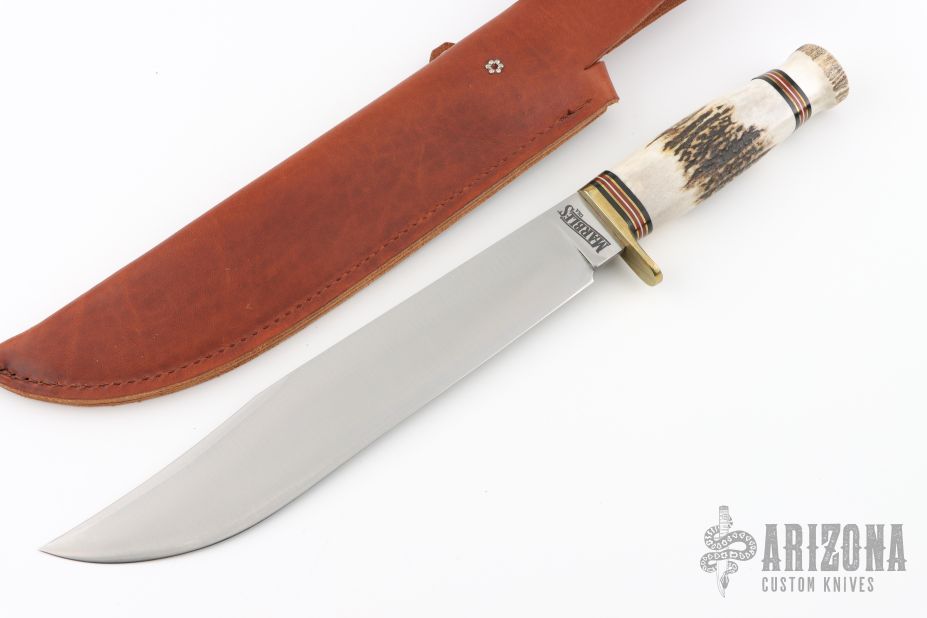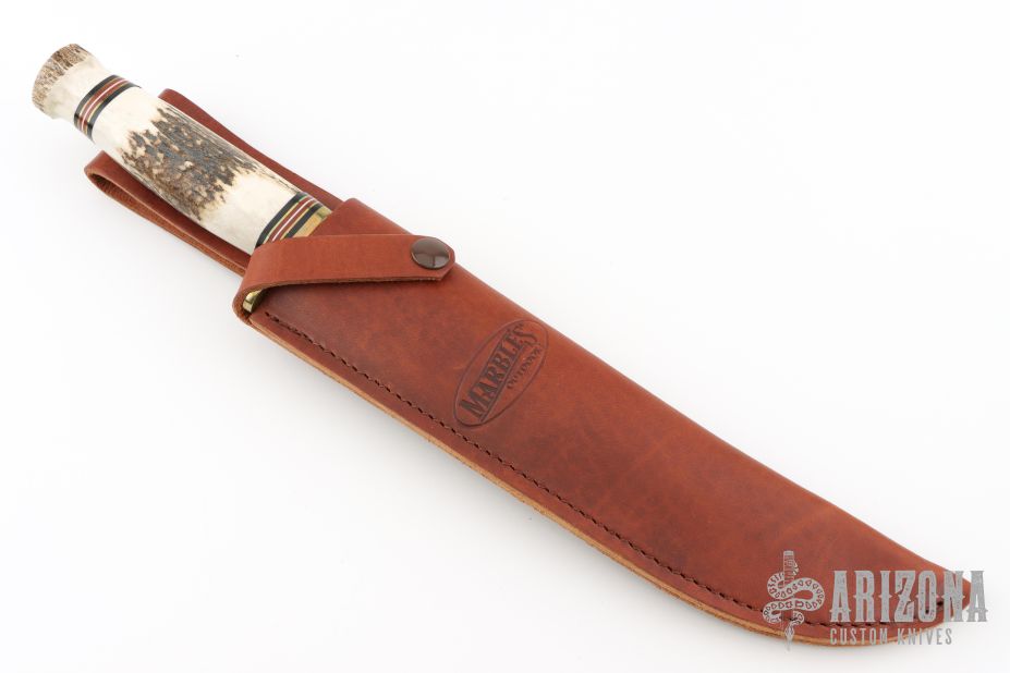 This Trail Maker by Marbles features a clip point satin finished blade with a false top edge, .228" blade stock and 1.710" blade depth, hidden tang construction. The handle has a brass guard, stag butt, stag grip and black/brass/red/white spacer pattern. Comes with original brown leather sheath. Excellent condition.