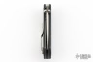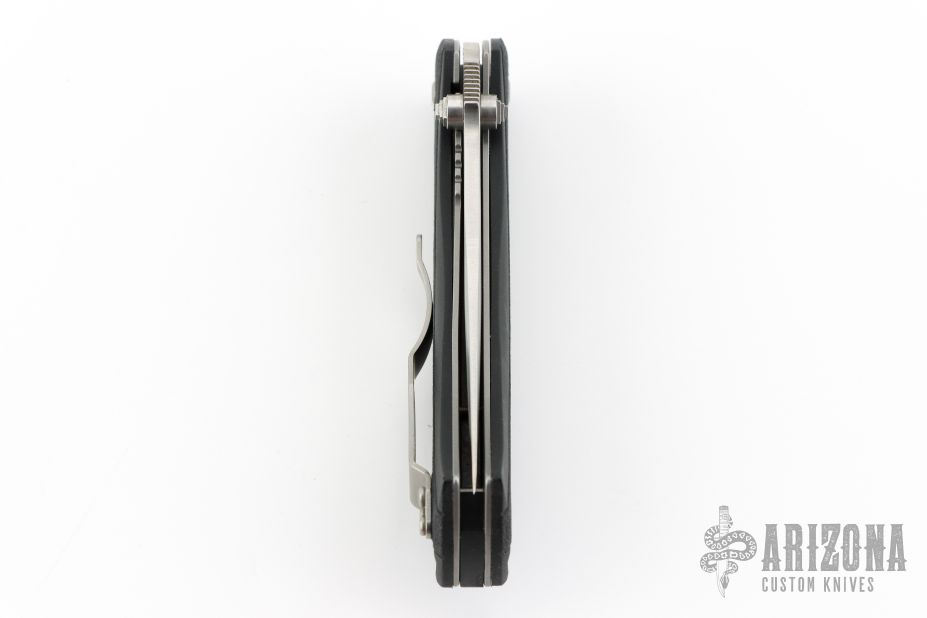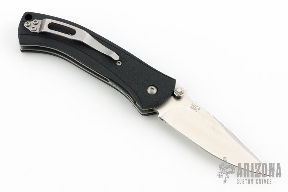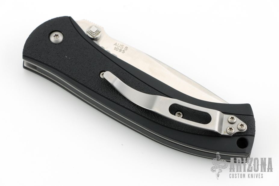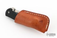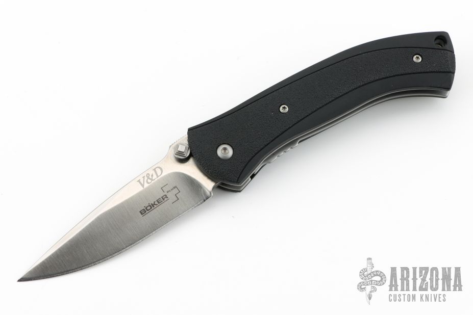 This Scale Release Automatic from V&D Knives (Butch Vallotton and Matt Diskin) features a satin finished spear point blade with swedge, dual thumb studs and notched thumb rest. The handle has black polymer scales over steel liners and black polymer backspacer. Lanyard hole in pommel. Stainless steel tip up clip and lanyard hole in pommel. Includes a brown leather belt sheath. Excellent condition.