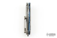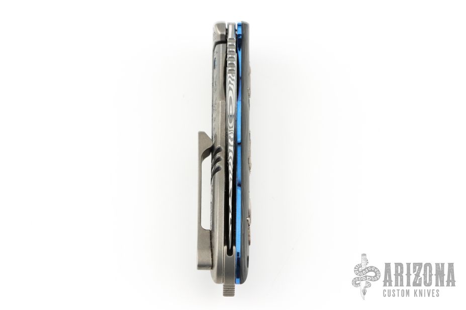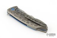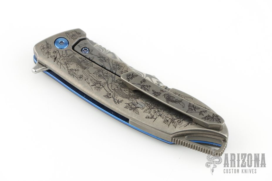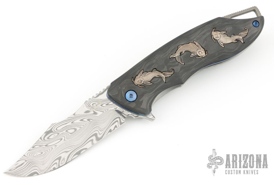 This S7 flipper by Michael Zieba features a polished Damasteel blade with a notched thumbrest and a flipper. The handle has a marble carbon fiber and laser engraved titanium frame, koi fish inlays, textured backspacer, an anodized titanium liner, and tip up clip with hidden screws. Nice detent, lockup and blade seating. Excellent condition. Comes with a zippered case and COA dated 12-6-21