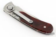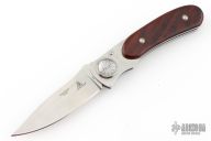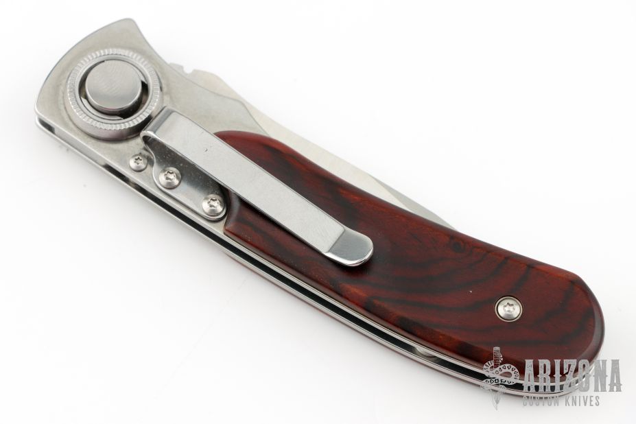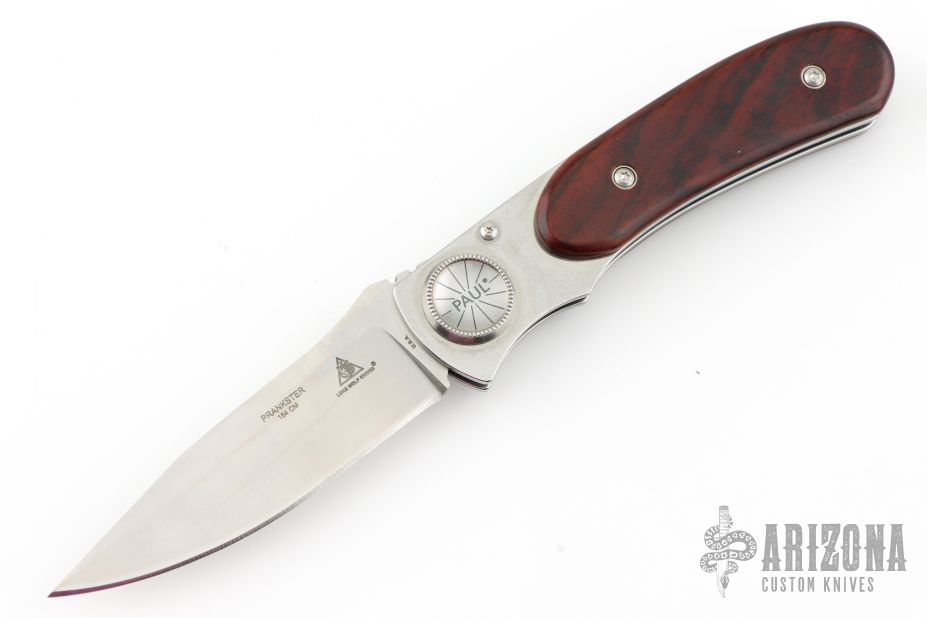 This Paul Prankster has a satin finished clip point blade with notched thumb rest. Handle is cocobolo over stonewashed stainless steel frame. Stainless steel tip down clip.  Very nice piece. Comes with a Lonewolf box for a Prankster with Black G-10 scales. Excellent condition.