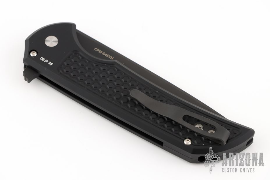 This Mordax by Pro-Tech is a Ferrum Forge design and features a black dlc drop point blade with notched flipper. The handle has milled a black aluminum frame with black tip up stainless steel clip. Mother of pearl inlaid push button. Comes with original box pouch and papers. Excellent condition. #05 of 80