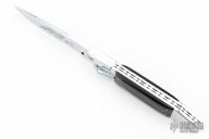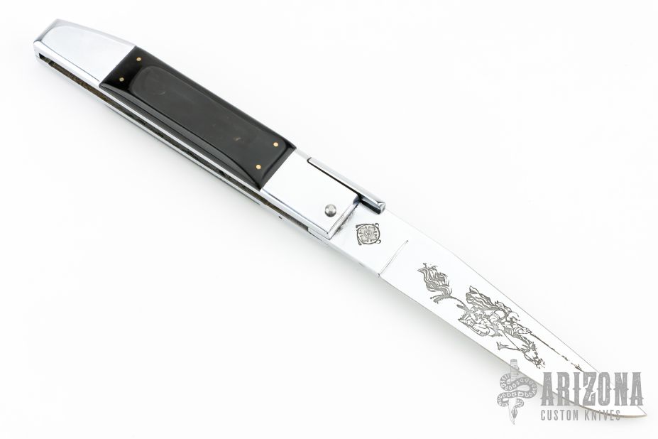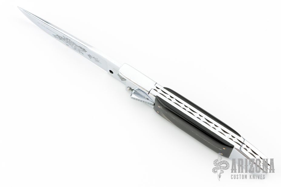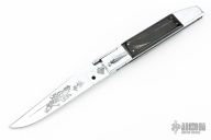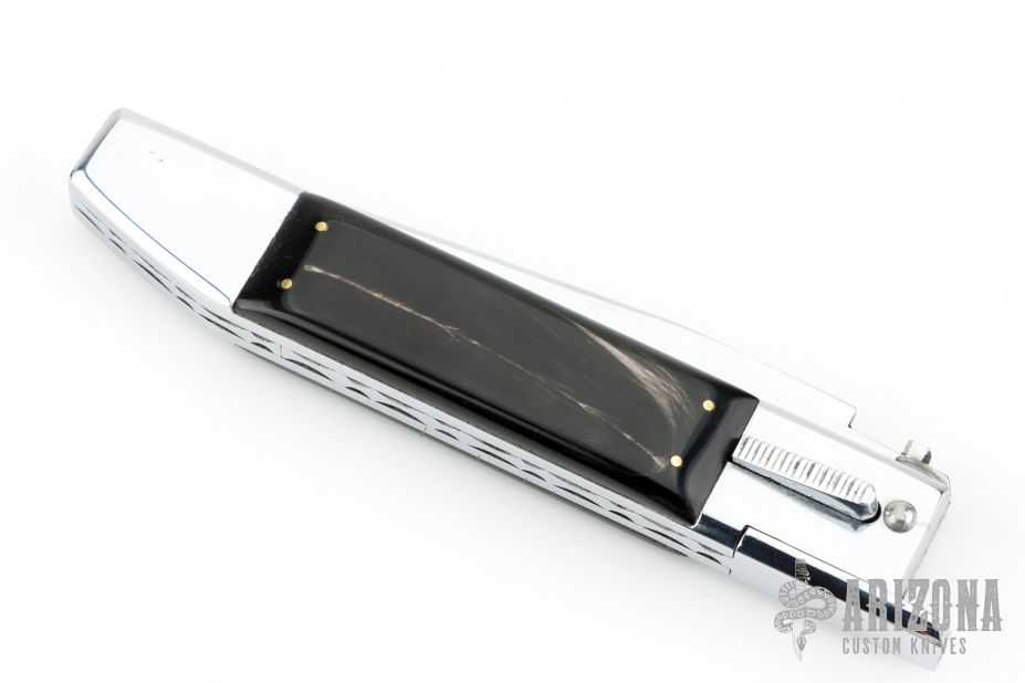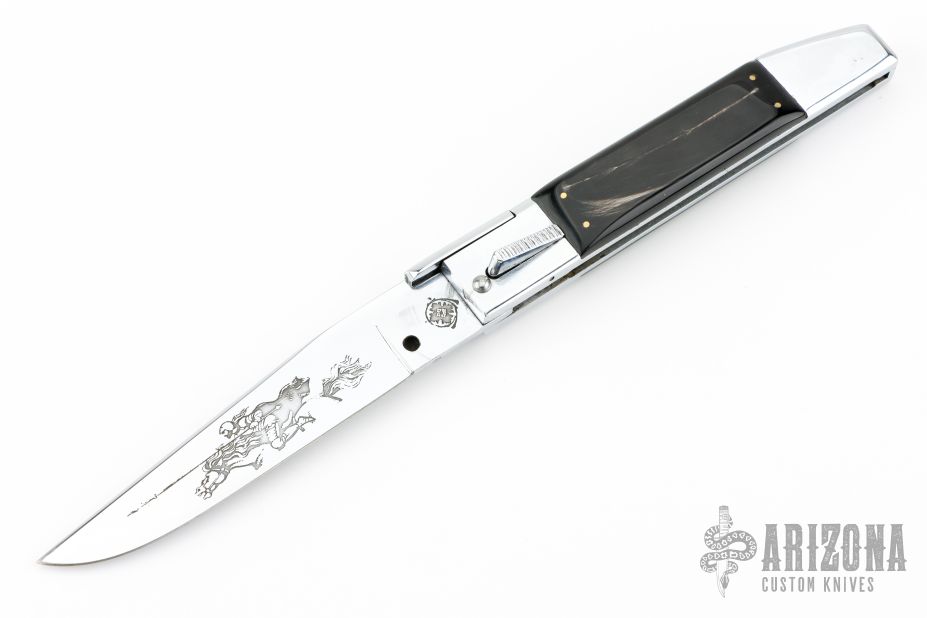 This Picklock Auto by Agasi Hambartsumian of Armenian Doctor Knives features a mirror polished blade with etching. The handle has a polished stainless steel frame with fileworked stainless steel backspacer, buffalo horn scales with brass pins. New from maker.
