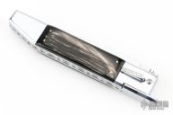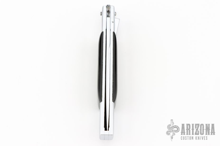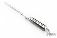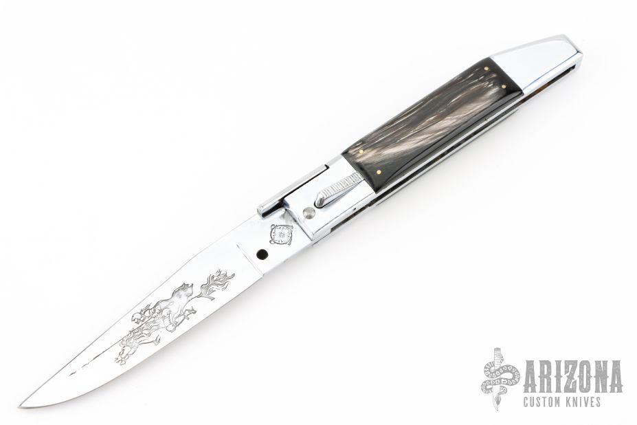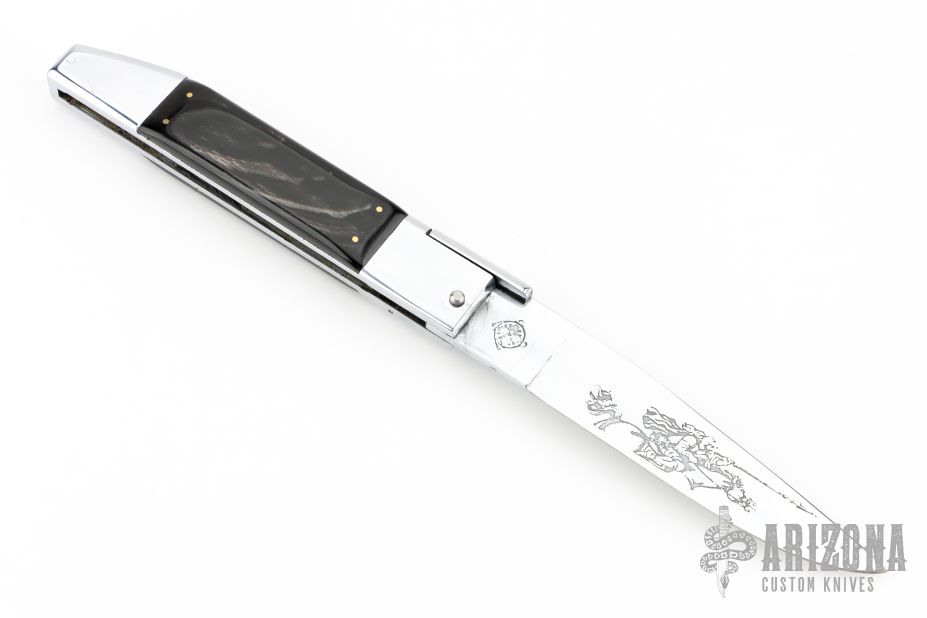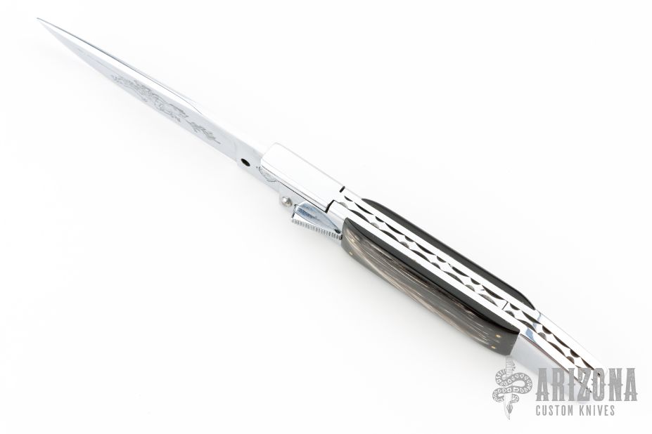 This Picklock Auto by Agasi Hambartsumian of Armenian Doctor Knives features a mirror polished blade with etching. The handle has a polished stainless steel frame with fileworked stainless steel backspacer, buffalo horn scales with brass pins. New from maker.