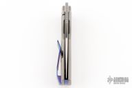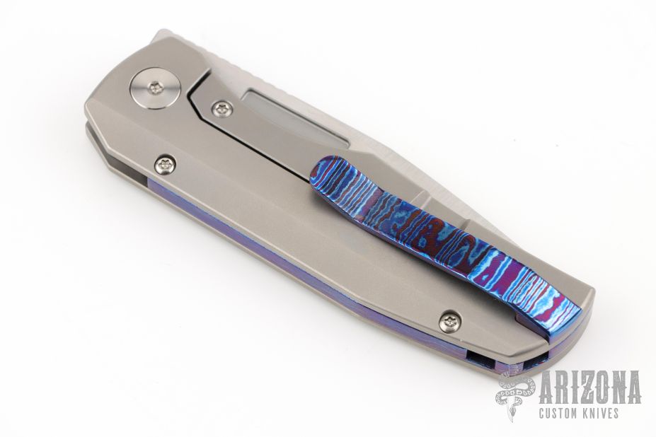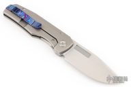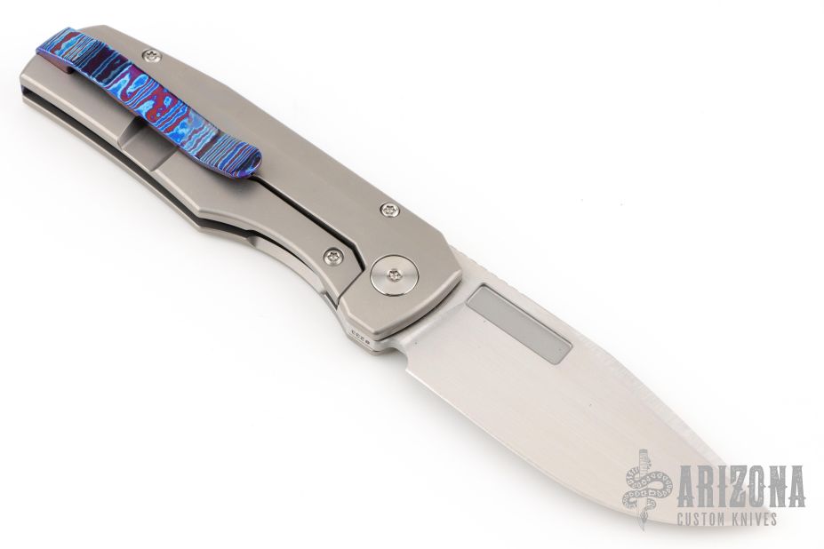 This Axon First Run Folder by Vero Engineering features a hand rub satin finished blade with notched thumbrest and thumbhole. The handle has a bead blasted titanium frame with stainless steel lockface incert, Timascus tip up clip with hidden screws, Timascus backspacer. Rides on bearings, nice detent, lockup and blade seating. Includes a padded zippered case, box and coa. Listing also includes original clip, backstrap, and hardware. Excellent Conditon.