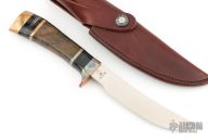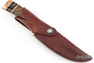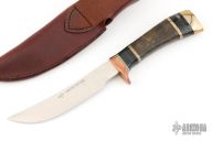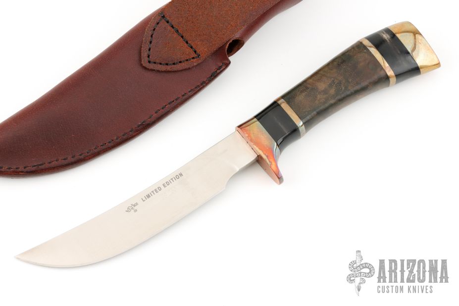 Blade: A trailing point Skinner, this blade is a timeless companion for hunters young and old. The high height hollow grind offers exceptional slicing performance with a fine tip for detail work. A large, unsharpened ricasso allows for a close grip for added control.