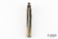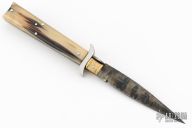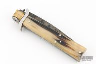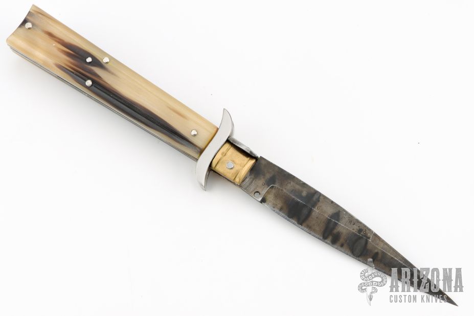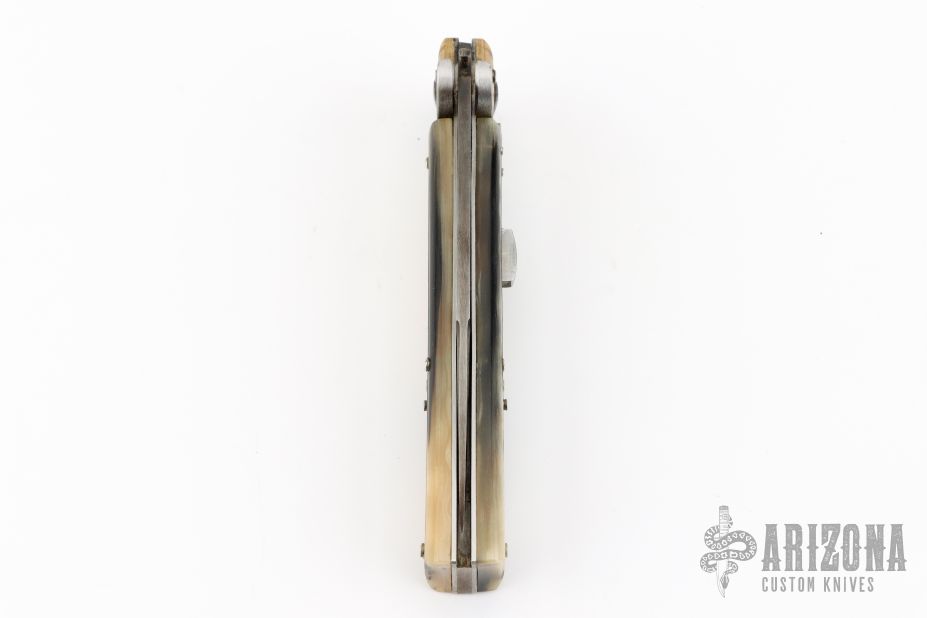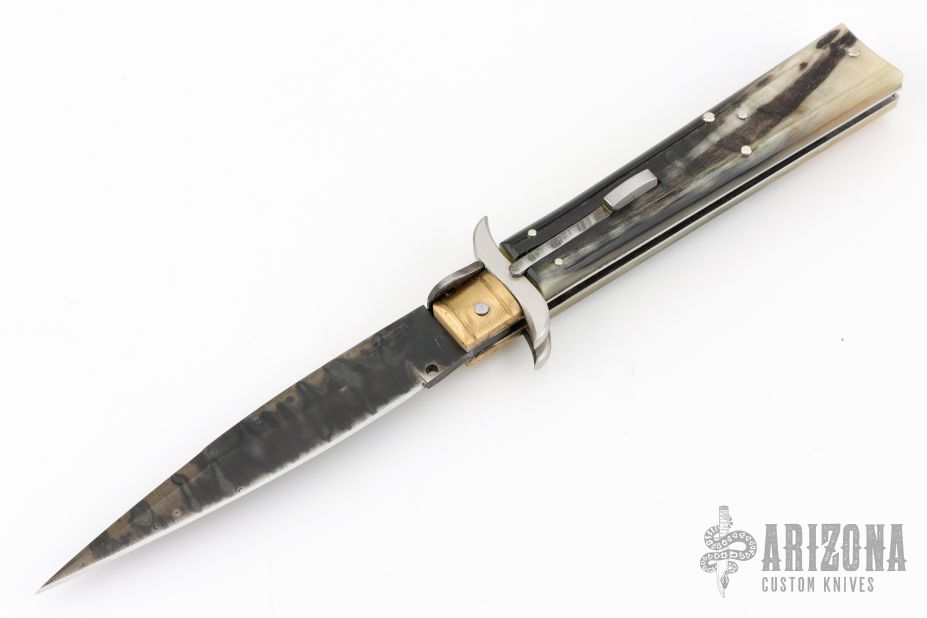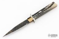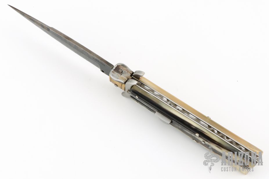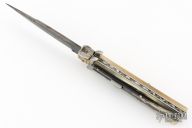This Picklock Auto by Antonio Contini features an antique finished blade with false top edge. The handle has brass bolsters, stainless steel cross guard and liners with ram's horn scales. fileworked stainless steel backspacer. Nice action and lockup. Excellent condition. Comes with original box and COA dated 3/28/23