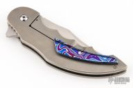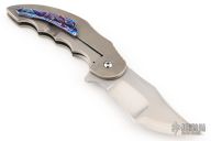 This Homicide #71 by Jeff VanderMeulen has a hand rub satin finished, multi-ground blade with notched thumbrest and flipper.  The handle has a orange peel finished titanium frame and tip up Mokuti clip with hidden screws. Comes with a zippered case and COA. Excellent condition.