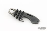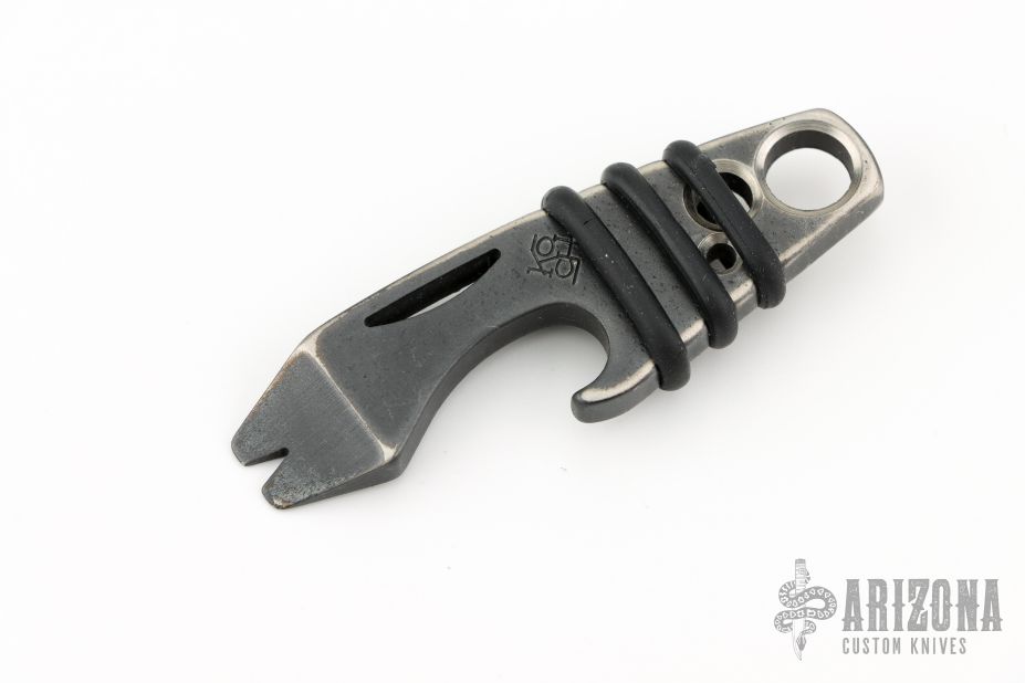 This Kap Lifter by Justin Koch features titanium construction with a distressed black finish. It features a pry tip with nail puller notch and bottle opener. Has a distressed finish, otherwise good condition. .207" thick.
