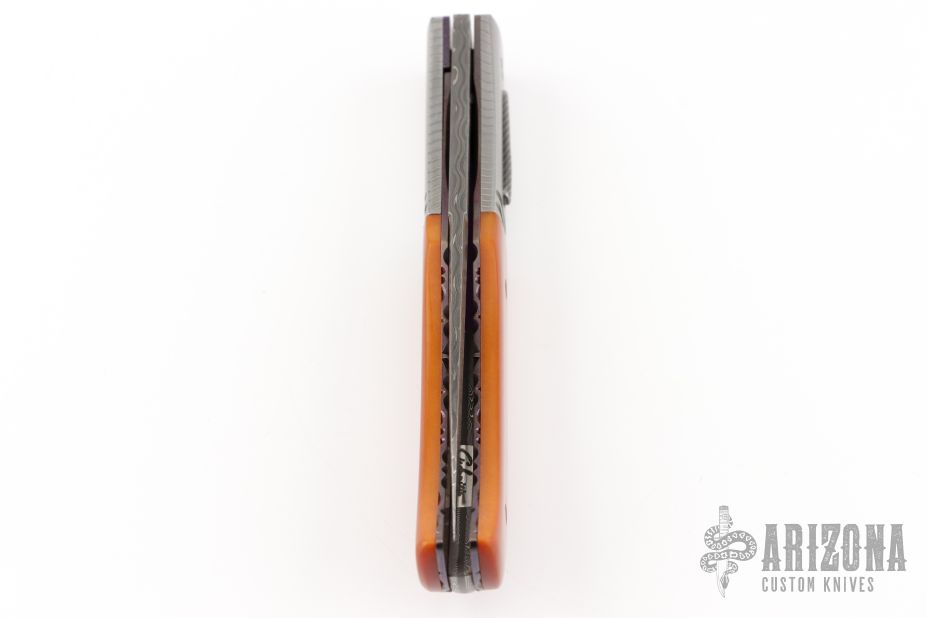 This linerlock automatic by Chuck Gedraitis features a Mike Norris Fire Clone Damascus blade with false top edge. The handle has Herringbone Damascus fluted bolsters, Damascus button, Antique Bakelite scales, anodized and fileworked titanium liners, Damascus backspacer. Nice detent, lockup and blade seating. Comes with COA. Excellent condition.