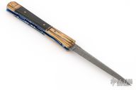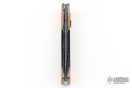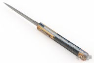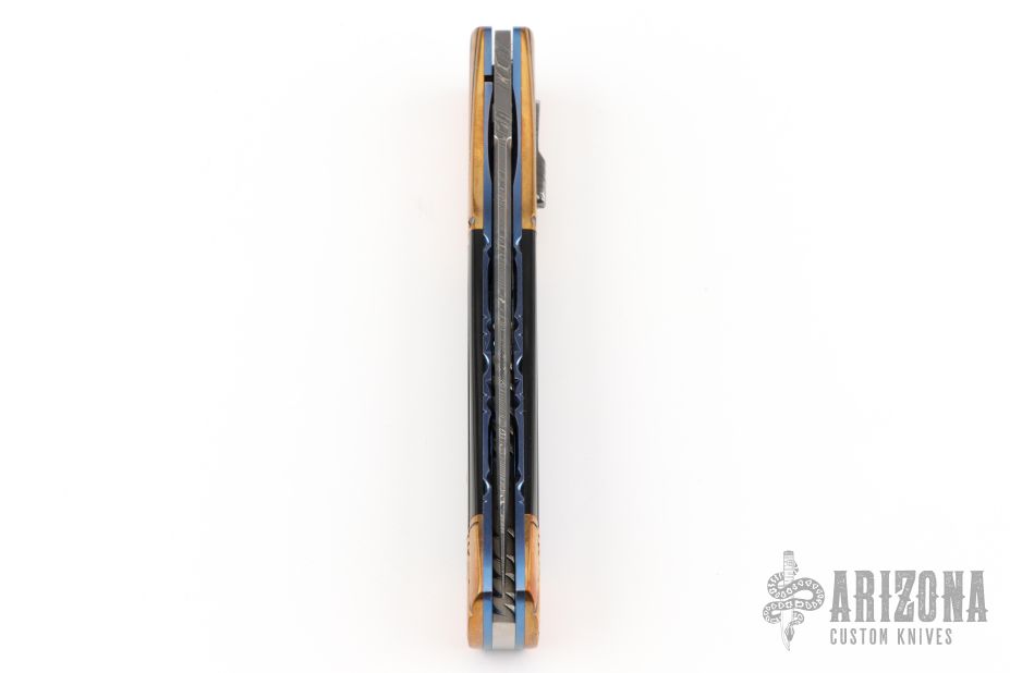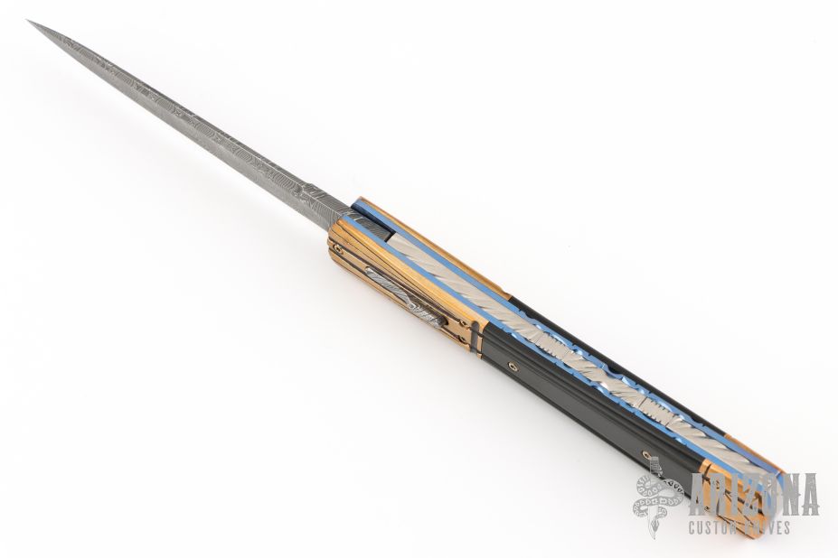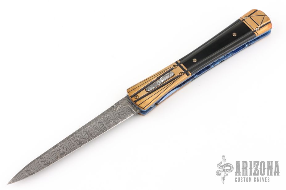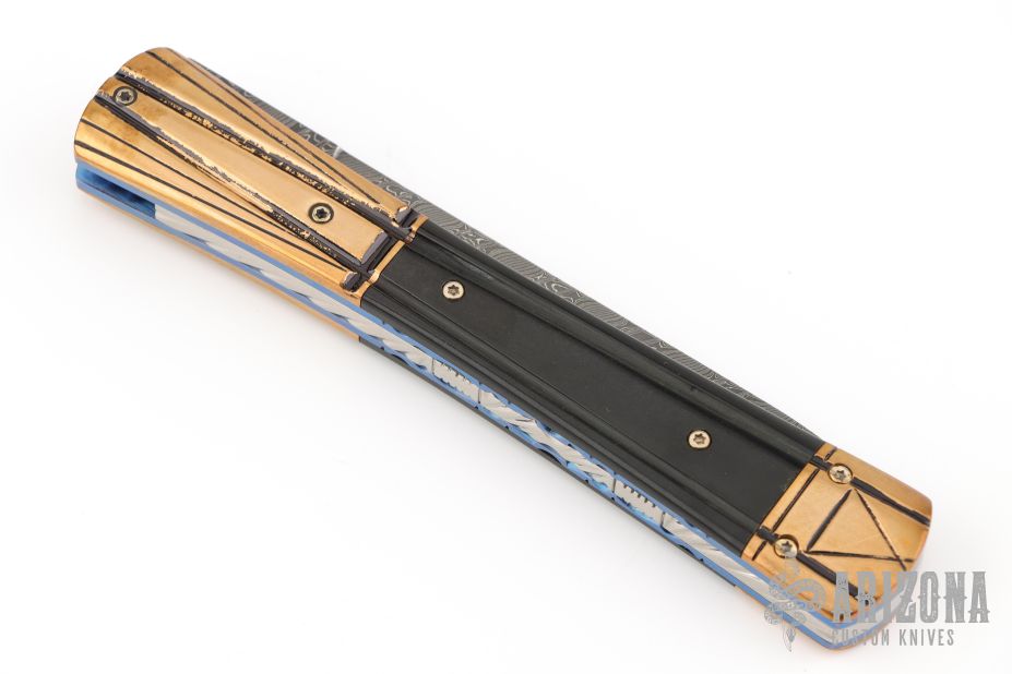 This linerlock automatic by Chuck Gedraitis features a Mike Norris Fire Clone Damascus blade with false top edge. The handle has carved/fluted bronze bolsters, Damascus button, fluted black paper micarta scales, anodized and fileworked titanium liners, fileworked titanium backspacer. Nice detent, lockup and blade seating. Comes with COA. Excellent condition.
