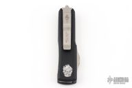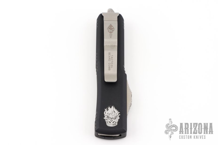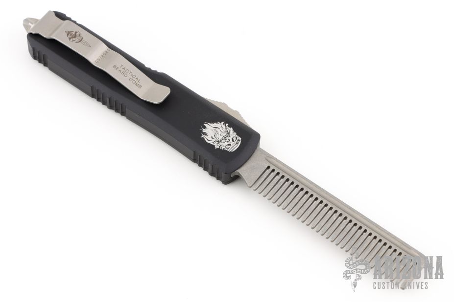This UTX-85 OTF automatic Tactical Beard Comb by Marfione Custom Knives features a fine tooth hand ground stonewashed comb blade, and a black aluminum handle with tip down bead blasted stainless steel clip. Dated 02/2021. Comes with box, metal COA and beard oil. Excellent condition.