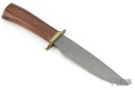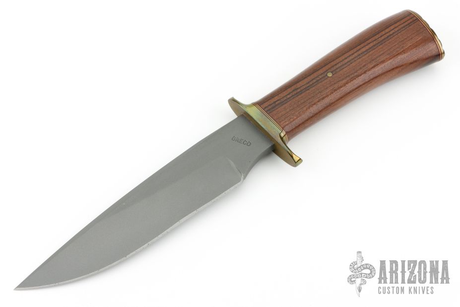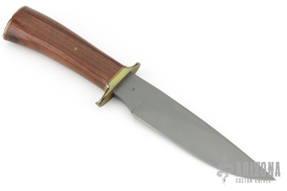 This custom fighter by John Greco features a grey coated blade with a false top edge, .262" blade stock, 1.482" blade depth, hidden tang construction. The handle has a brass guard and butt, wood grip and red/brass spacers. Nice feel in hand. #5 stamped on ricasso. Has some patina and scuffs on the guard. Excellent condition otherwise.