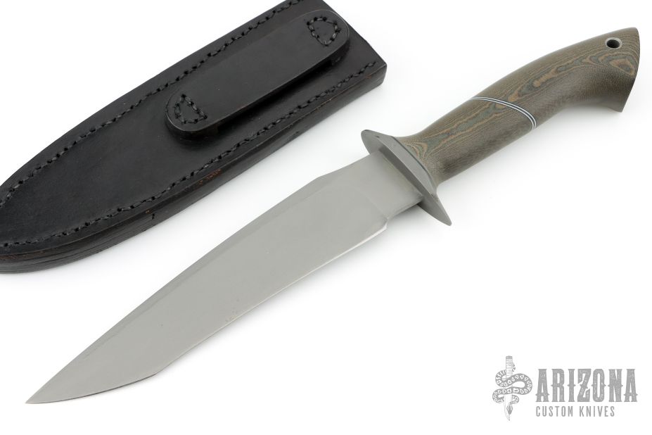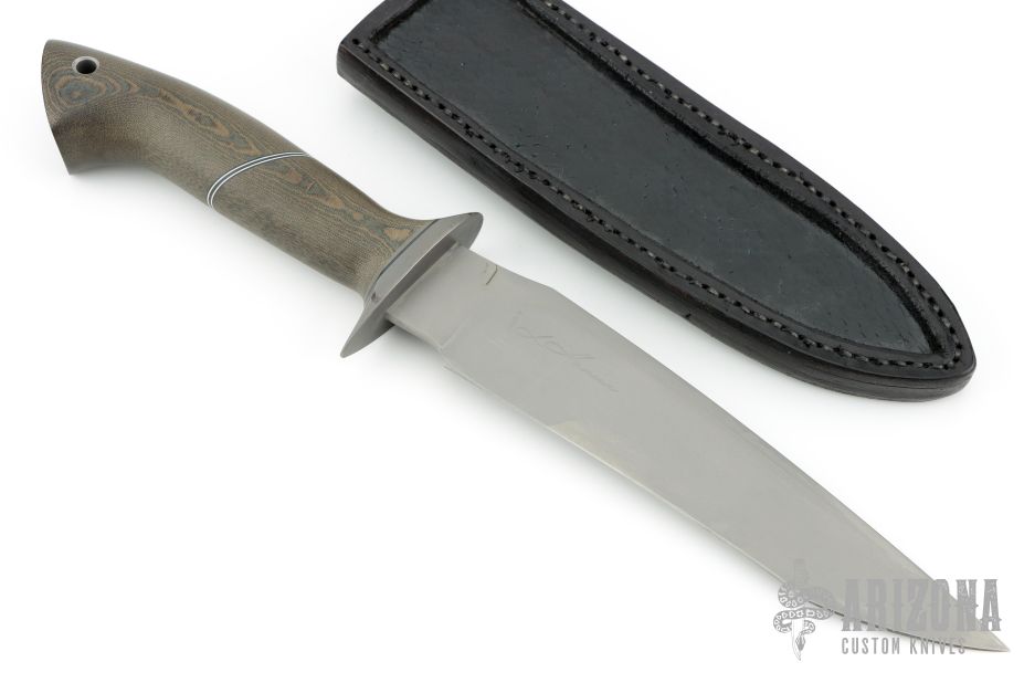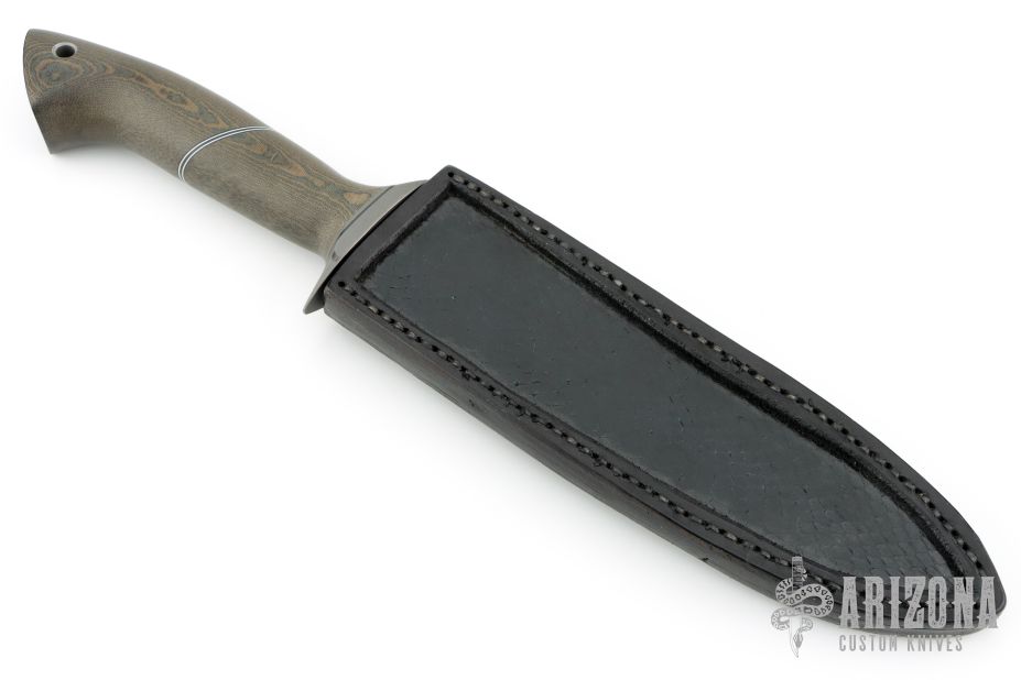 This custom fighter by Lonnie Hansen features a grey coated blade with a false top edge, .195" blade stock, 1.558" blade depth, hidden tang construction. The handle has a bead blast finished guard, micarta grip and black/white spacers. Nice feel in hand. Comes with a black leather belt sheath. Has some patina and scuffs, great condition otherwise.