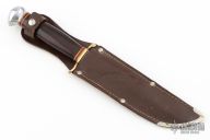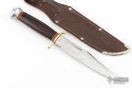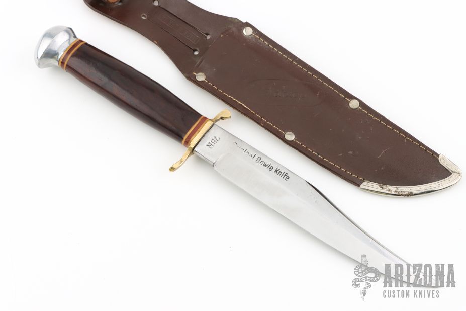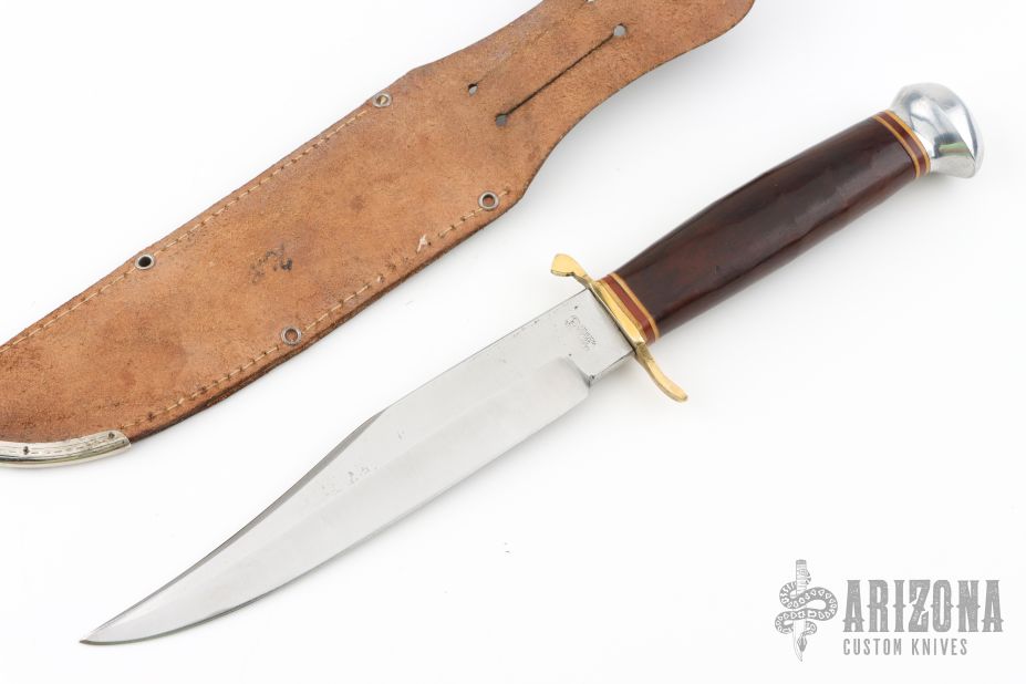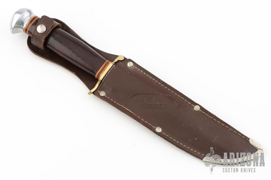 This knife from F.A. Bower Imp Co features a satin finished blade with false top edge, .217" blade stock and 1.062" blade depth, hidden tang construction. The handle has a brass guard and aluminum pommel with a rosewood grip and red/white spacers. Includes original brown leather sheath. Has scratches and patina, otherwise excellent condition for its age.