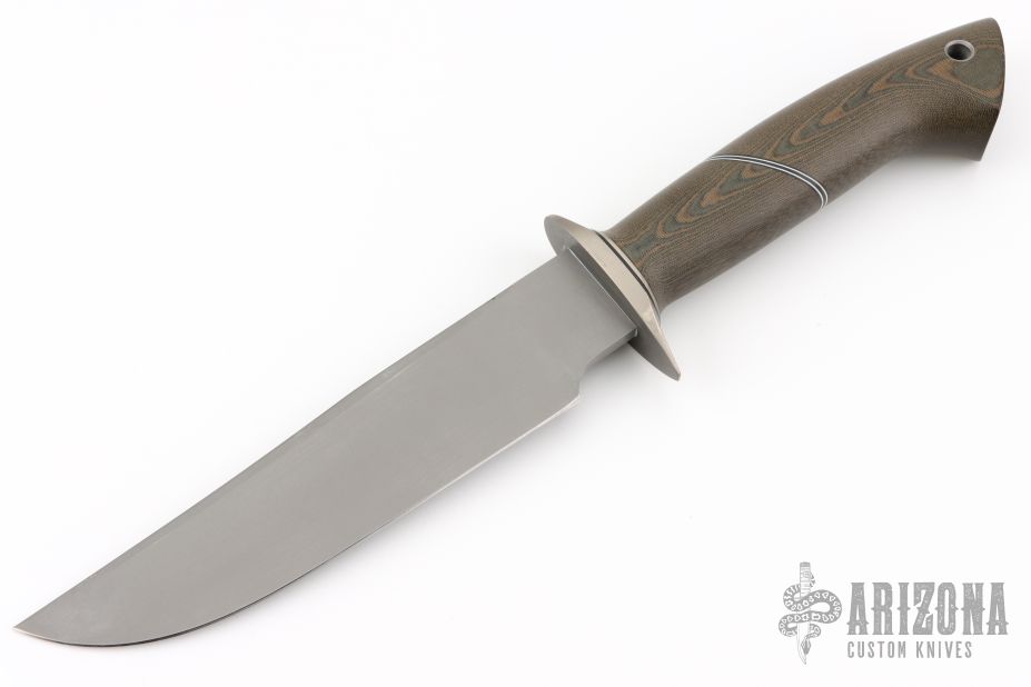 This custom fighter by Lonnie Hansen features a grey coated blade with a false top edge, .195" blade stock, 1.51" blade depth, hidden tang construction. The handle has a bead blast finished guard, micarta grip and black/white spacers. Nice feel in hand. Has some patina and scuffs, great condition otherwise.