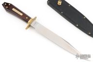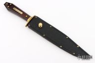 This is a discontinued Bill Bagwell designed Gambler Bowie, made by Ontario Knife Company. Features a satin finished clip point blade with a nearly sharpened top edge, .289" blade stock and 1.230" blade depth, hidden tang construction. The handle has a brass guard/collar/studs, and a dymondwood grip. Includes original black leather sheath. Has some light patina, excellent condition otherwise.
