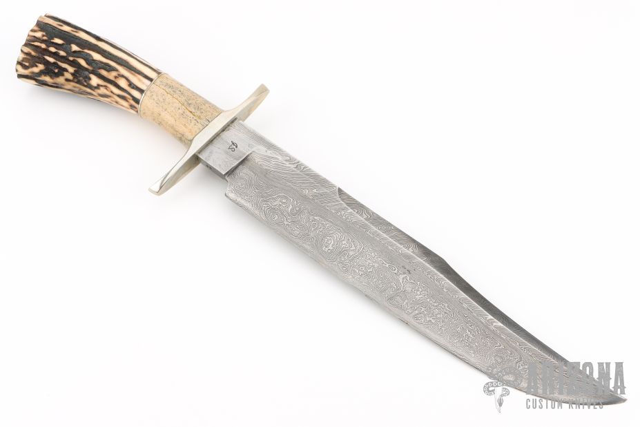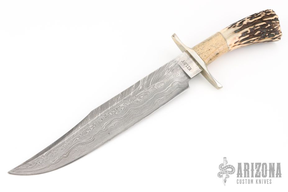 This Bowie by Master Smith Keith Kilby features a clip point Damascus blade with false top edge, .304" blade stock and 1.550" blade depth, hidden tang construction. The handle has a nickel silver guard, nickel silver spacer, bone spacer, and nice stag grip. Blade is marked JS. Has some scratches and patina, great condition otherwise.