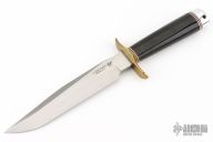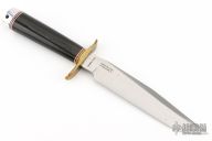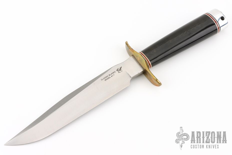 This Model 1-7 by Blackjack Knives features a satin finished blade with false top edge, .219" thick and 1.204" deep, hidden tang construction. Brass guard, green canvas micarta grip with black/red/white spacers and an aluminum butt. Has some scuffs, scratches and patina. Great condition otherwise.
