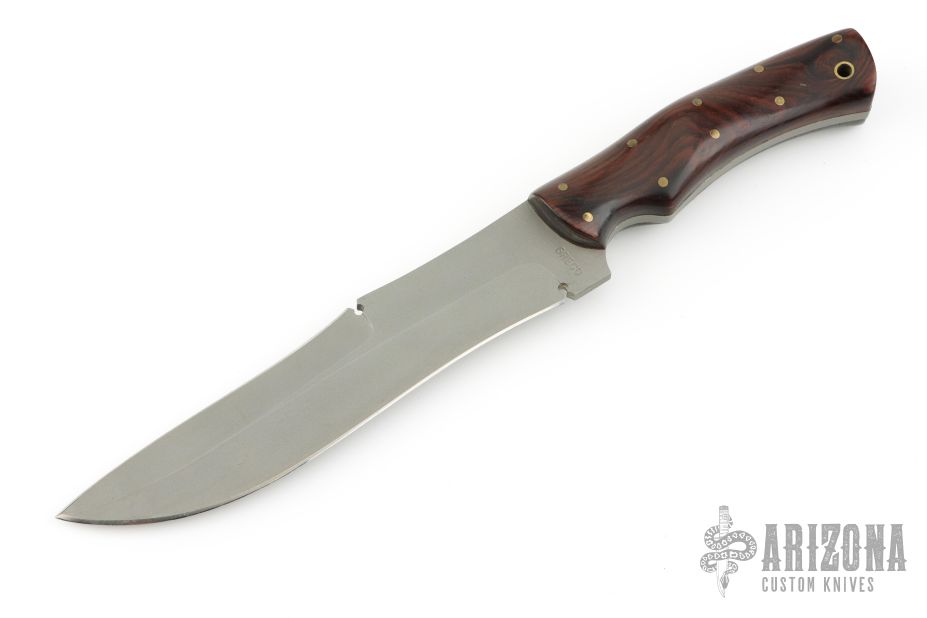 This Fighter by John Greco features a grey coated blade with top edge, .197" blade stock and 1.452" blade depth, full tang construction. The handle has pinned wood covers over full tang construction with lanyard hole. Has a couple light scuffs, otherwise Excellent condition.