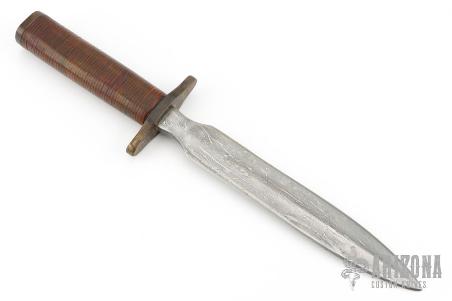 This Bowie by Floyd E Medlin features a Damascus blade with .303" blade stock and 1.126" blade depth, hidden tang construction. The handle has brass guard and butt and a stacked leather grip. Has scuffs, scratches and patina. Good condition otherwise.