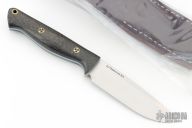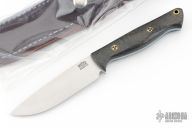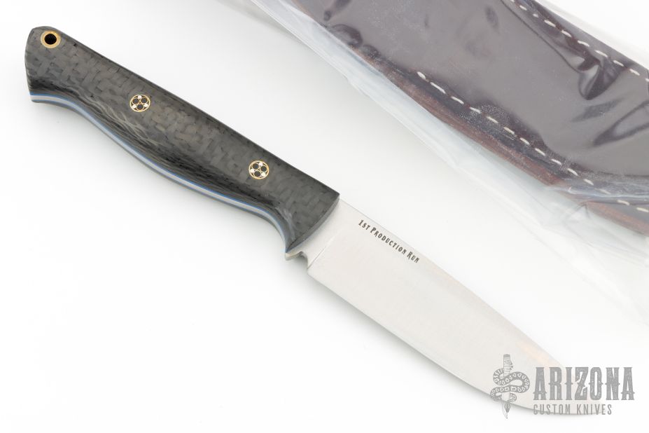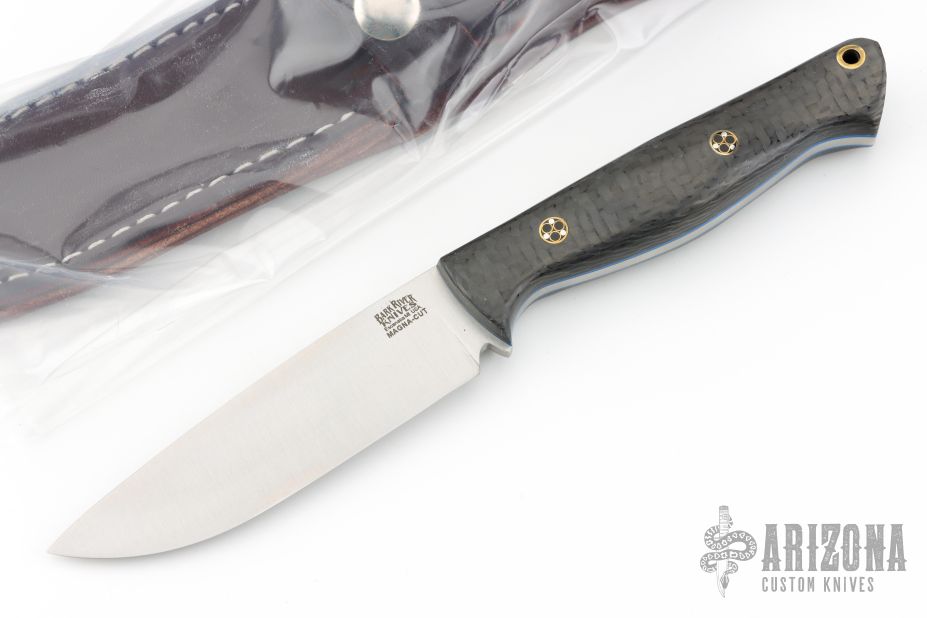 This Fox River EXT-1 LT by Bark River Knives features a satin finished blade with .125" blade stock and 1.055" blade depth, full tang construction. The handle has carbon fiber covers, blue liners, mosaic pins and lanyard hole in pommel. Comes with original box, papers, and leather sheath. Excellent condition.