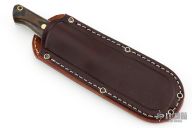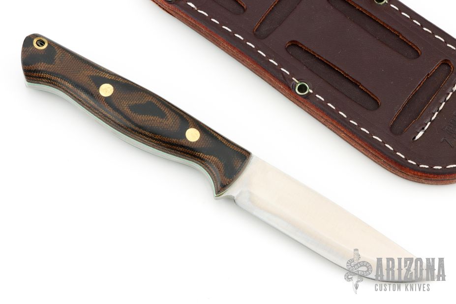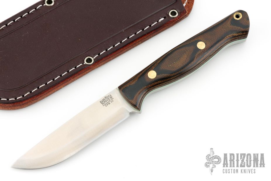This Gunny Scandi by Bark River Knives features a satin finished blade with .140" blade and .943" blade depth, full tang construction. The handle has snakeskin burgundy micarta covers with sea blue liners, pins, and lanyard hole in pommel. Comes with original box, papers, and leather sheath. Excellent condition.