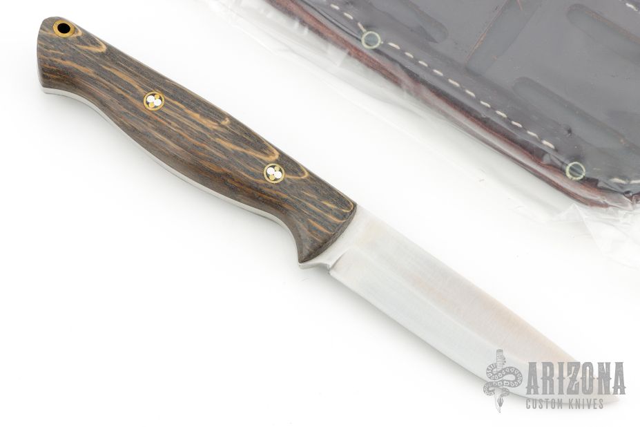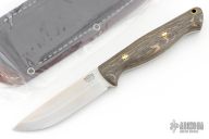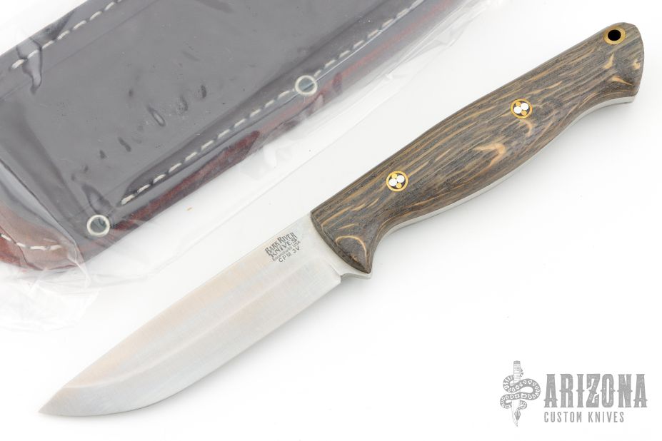 This Gunny Scandi by Bark River Knives features a satin finished blade with .141" blade and .92" blade depth, full tang construction. The handle has bog oak covers with mosaic pins, and lanyard hole in pommel. Comes with original box, papers, and leather sheath. Excellent condition.