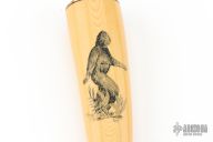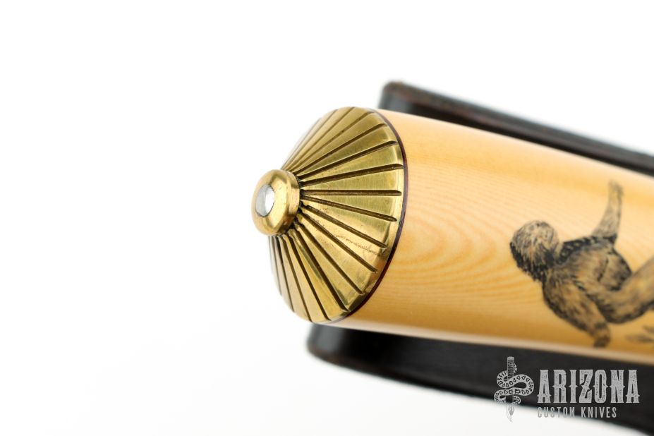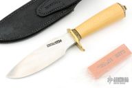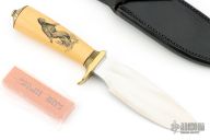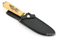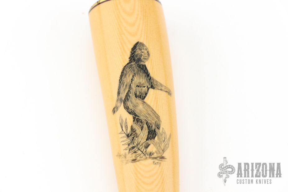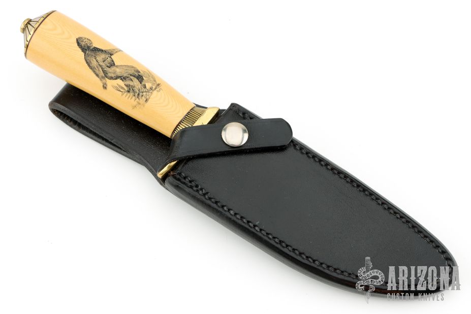 The Model 11 is the original drop-point blade. Designed by Tommy Thompson, noted Alaskan guide, in 1952 for big-game skinning, with point dropped below top of blade to prevent cutting too deeply through skins when used point first. The blade is satin finished with .251" blade stock and 1.391" blade depth, hidden tang construction. The handle has a brass guard and coolie cap butt, yellow paper micarta grip with black spacers. Comes with a black leather sheath and a Randall zippered case. Excellent condition. The handle has scrimshaw of Sasquatch by "PATTY". Loosely this custom Randall was most likely made between 1975 and 1985