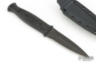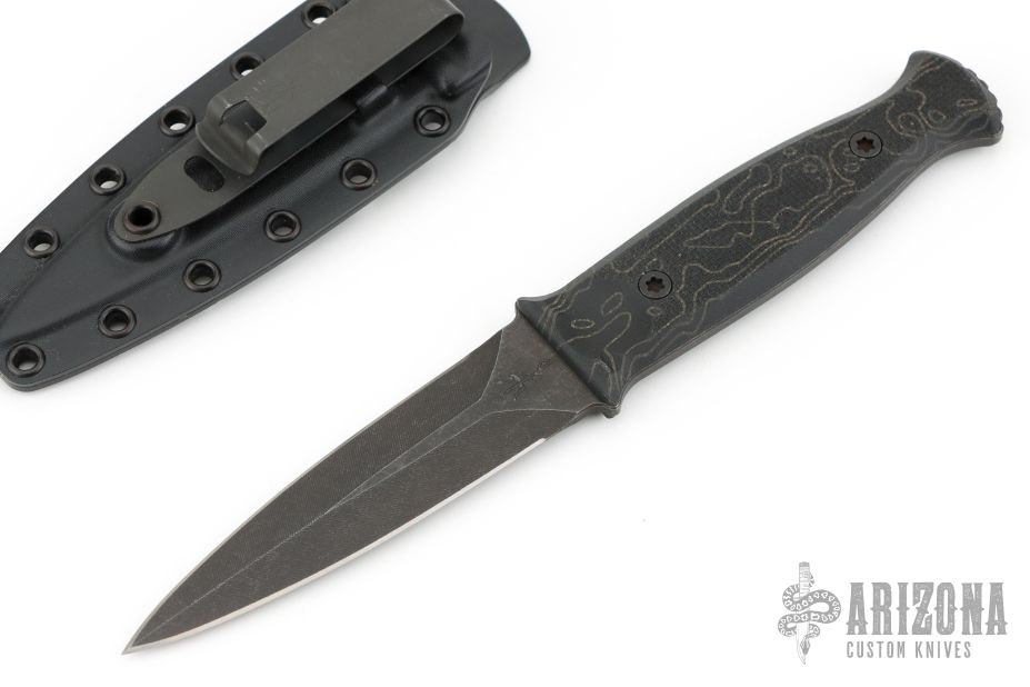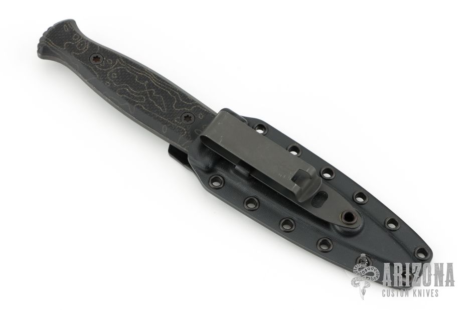 This knife features a black acid tumbled double-edged blade with a full tang construction .147" blade stock and .940" blade depth. The handle has G-10 scales. Comes with a kydex sheath with clip. Excellent Condition.