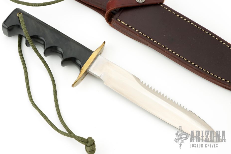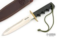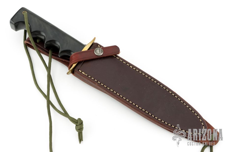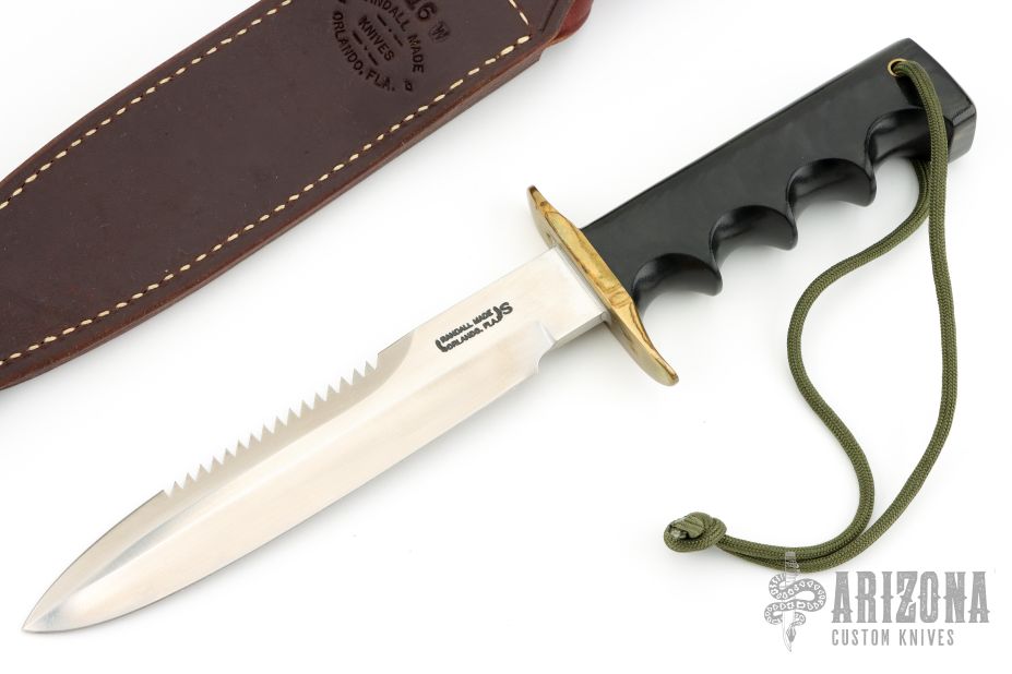 The Model 16-7 Diver or Special Fighter was designed especially for heavy-duty salt water use and is as nearly indestructible as possible. This knife has a stainless steel blade with sawteeth, .202" blade stock and 1.212" blade depth, full tang construction. The handle has a brass guard, black linen micarta finger groove handle with a lanyard hole. Comes with a waxed brown leather sheath. Excellent condition.