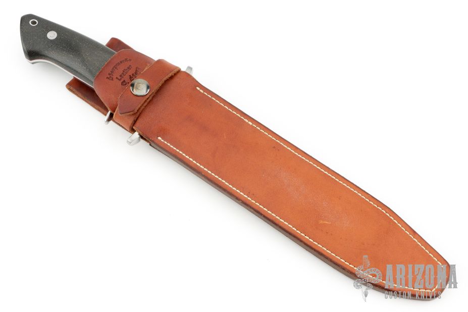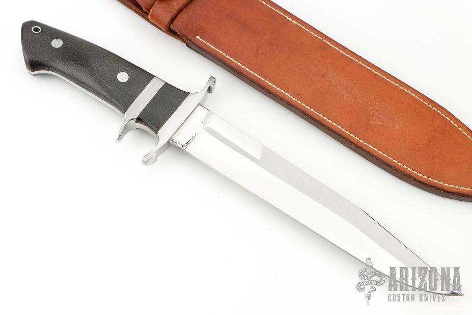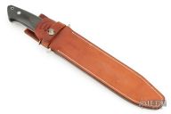 This Sub-hilt Fighter by David Sharp features a mirror polished blade with sharpened top edge, .284" blade stock, 1.389" blade depth, full tapered tang. The handle has a satin finished stainless steel guard and sub-hilt, lightning strike carbon fiber scales with red liners. Comes with a brown leather sheath. Has a couple light scratches, otherwise excellent condition.