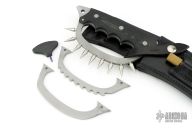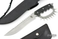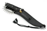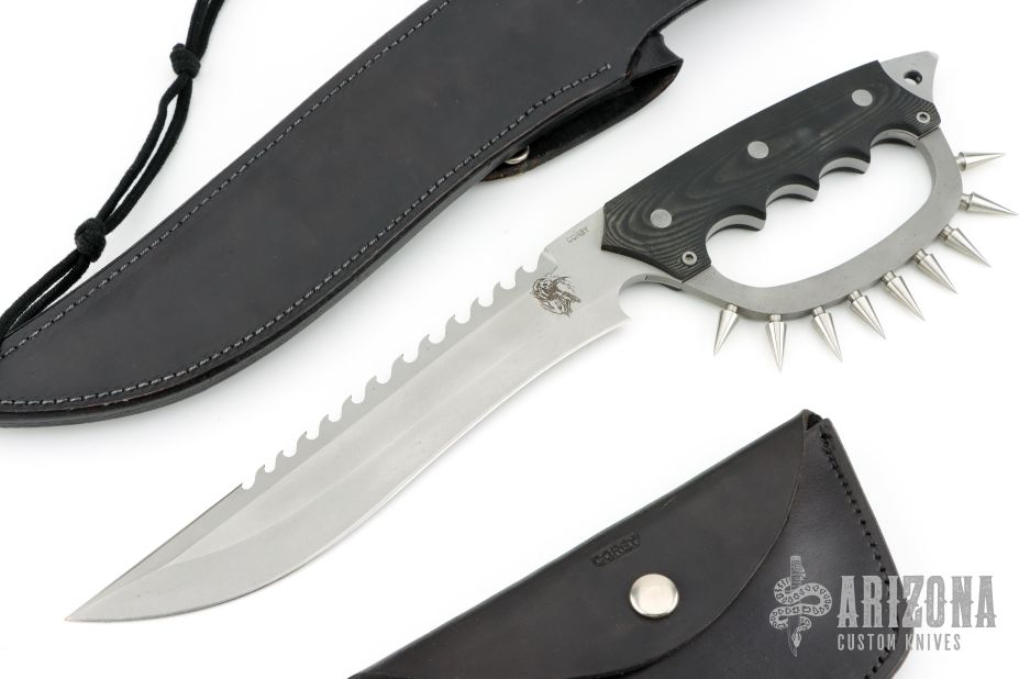 This custom fixed "The Devil's Right Hand" by Harold Corby features a bead blast finish blade with sawteeth on the spine, .247" blade stock and 1.664" blade depth, full tang construction. The handle has black linen micarta scales, removable D-guard with 9 spikes, extended tang with lanyard hole. #20 on blade and removable D-guard. Comes with a black leather sheath with belt loop and sharpening rod. Comes with another black leather sheath that holds two additional D-Guards and a tool to change them, one of them has sawteeth and the other has a sharpened edge. Excellent condition.
