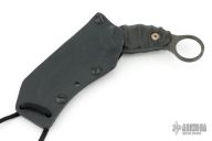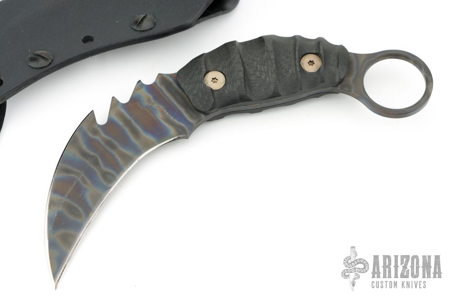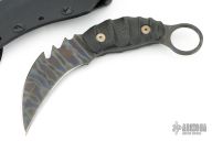 This MSC PS Karambit by Mick Strider features a flamed titanium blade with sharpened top edge, .147" blade stock and 1.319" blade depth, full tang construction. The handle has carbon fiber scales, ring at the butt. Comes with kydex sheath. Has some scuffs on the blade, otherwise excellent condition.