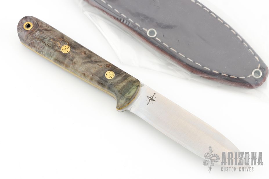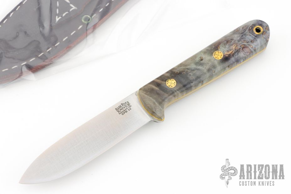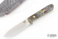 This Mini Kephart from Bark River features a satin finish drop point blade with full flat grind, .093" blade stock and .856" blade depth, full tang construction. The handle has maple burl covers, with mosaic pins, yellow liners, and lanyard hole in pommel. Comes with original box, papers, and leather sheath. Excellent condition.