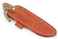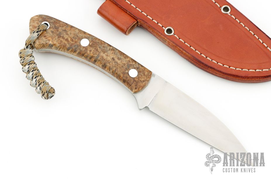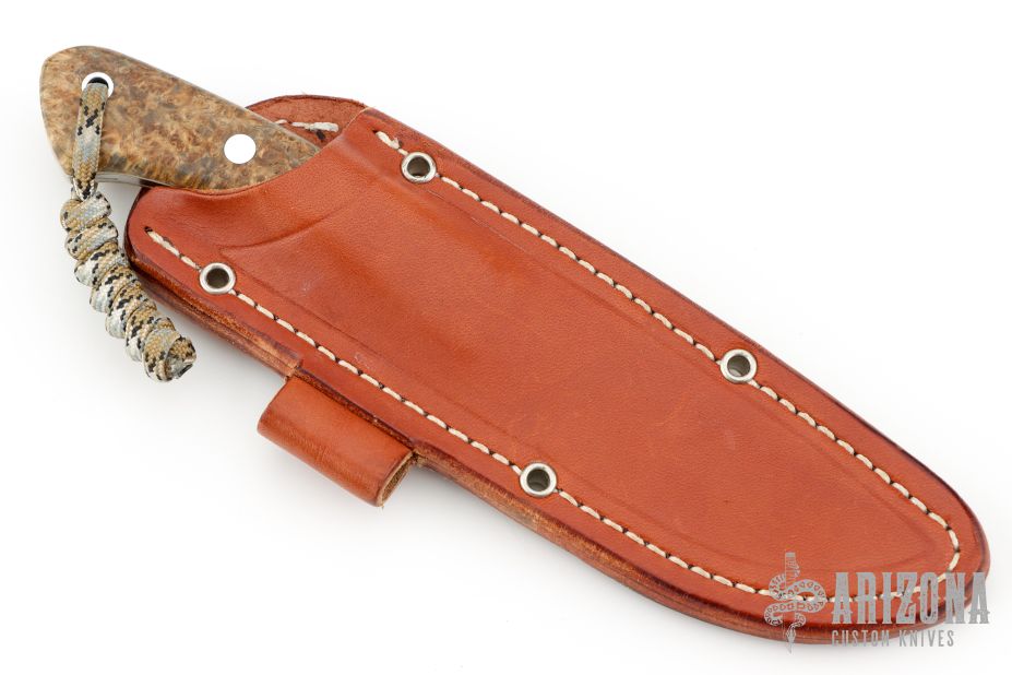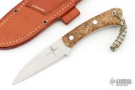 The Goshawk by Zoe Crist Knives has a satin finish blade, .128" black stock and .995" blade depth, full tang construction. The handle has Amboynia Burl covers with white liners, and lanyard hole in pommel. Comes with original box, papers, and leather sheath. Excellent condition.