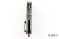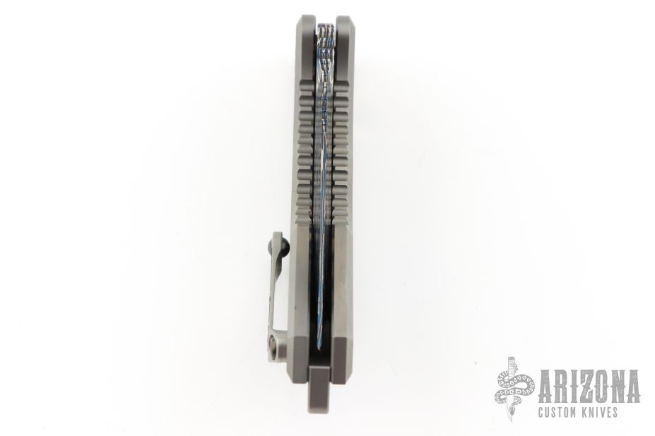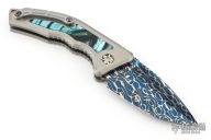 This Medusa by Heretic Knives features a Blued Vegas Forge Damascus multi-ground tanto blade with false top edge, notched thumbrest. The handle has a two-tone titanium frame with cross cut mammoth ivory inlays, titanium backspacer and a tip up clip with ceramic ball. Comes with original box, COA, zippered case and drawstring bag.  S/N 011 and dated 08/23.  Excellent condition.