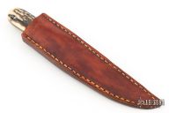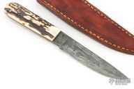This Hunter by Master Smith Bill Bagwell features a Damascus blade with .183" blade stock at the ricasso and 1.012" blade depth, full taper tang construction. The handle has very nice stag covers with stainless pins. Has some light scratches, and patina. Otherwise excellent condition for it's age! Made in in Longview Texas in 2010.