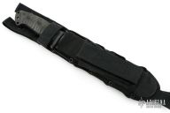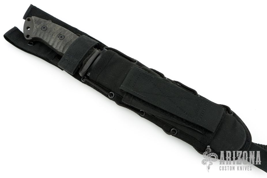 This Fighter by Edmondson Elite features a black blade with notched thumbrest and nearly sharpened top edge, .258" blade stock and 1.766" blade depth, full tang construction. The handle has black canvas micarta scales. Comes with a Spec-Ops black nylon sheath. Has some light scratches on the blade finish, otherwise excellent condition.