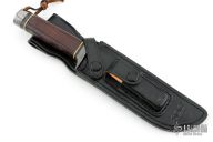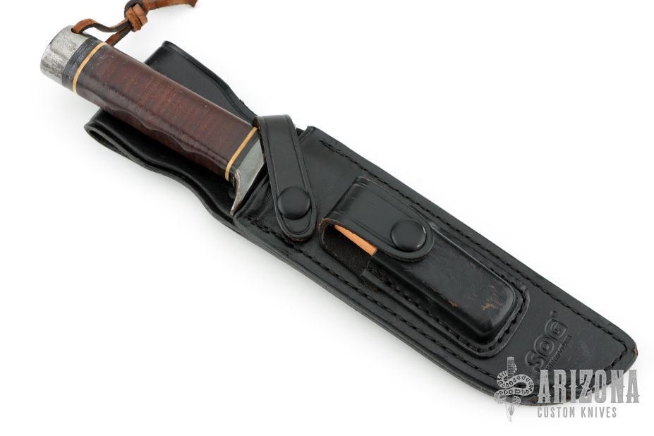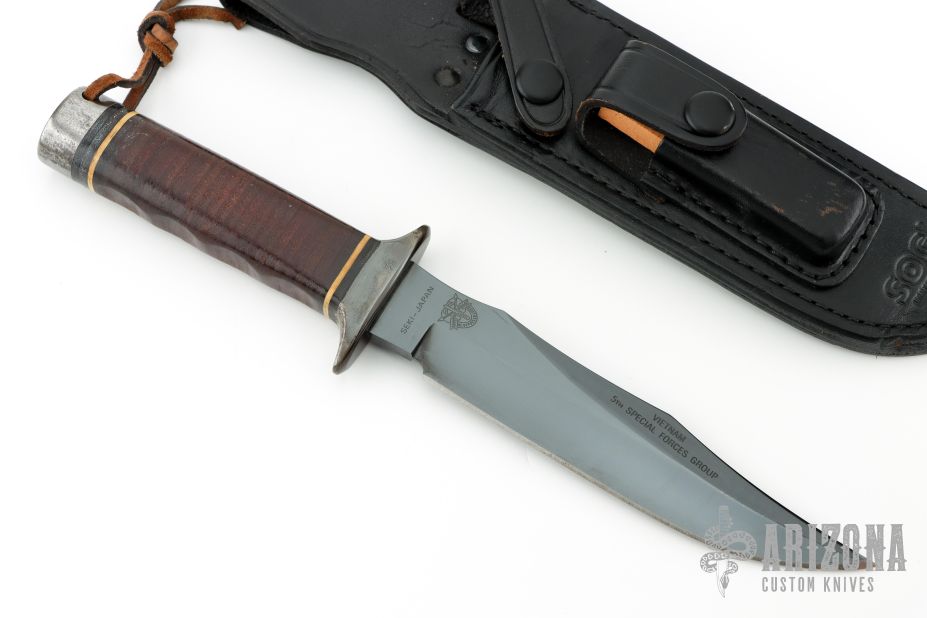 This S1 Bowie (Vietnam 5th Special Forces Group) has a black coated clip point blade with hidden tang and double guard. Blade width is just under 1/4", depth 1-1/4". Handle is contoured stacked leather with white spacers, black coated steel butt cap and lanyard hole. Comes with a black leather sheath. Very Rare. Blade is marked "SOG SPECIALTY KNIVES" on the presentation side. The non-presentation side has the Special Forces crest on the ricasso and "VIETNAM 5th Special Forces Group" on the swedge. Comes with original sheath and a zippered case. Has some wear on the finish on the guard and butt, otherwise excellent condition.